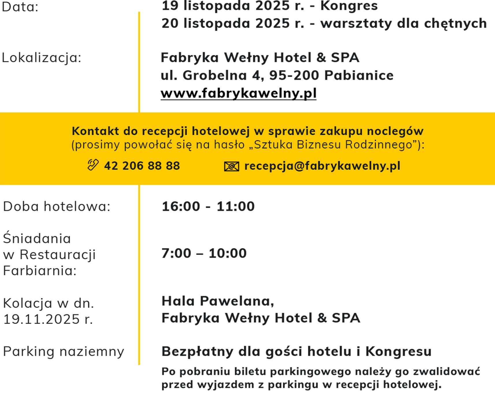 Uprzejmie informujemy, że Organizator nie pokrywa kosztów noclegu. Jeżeli są Państwo zainteresowani skorzystaniem z noclegu w hotelu Fabryka Wełny Hotel & SPA w Pabianicach, prosimy o bezpośredni kontakt z hotelem i powołanie się na hasło „Sztuka Biznesu Rodzinnego”: